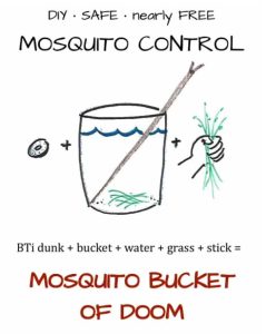 Ferguson Parks and Rec will make mosquito dunks available to residents during the ECO Fair at the Farmers Market on August 17. They will also have buckets available so residents can make their own Buckets of Doom by simply adding grass clippings and a stick for the females to enter to lay their eggs. You’ll be welcome to take ingredients for a neighbor or two, as well. If you don’t make it to the ECO Fair, you can find mosquito dunks at most big-box and smaller hardware stores. (At our West Ferguson Neighbors July Gathering, we provided these materials. Other neighborhood organizations might like to do the same at future neighborhood events.)